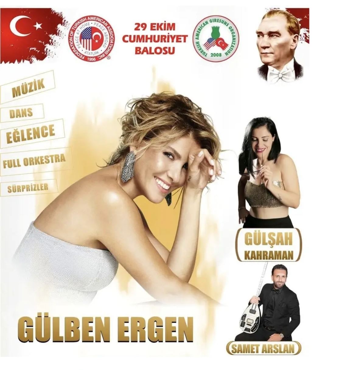 Cumhuriyet Balosu’na katılanları unutulmaz bir müzik şöleni bekliyor. Türk müziğinin sevilen sanatçısı Gülben Ergen, sahne performansıyla geceye damgasını vuracak. Onun yanı sıra, güçlü sesiyle tanınan Gülşah Kahraman, genç yorumcu Samet Arslan ve kemençesiyle gönüllere dokunan Melih Akçay sahnede olacak. Ayrıca özel dans gösterileri ile geceye ayrı bir renk katılacak.