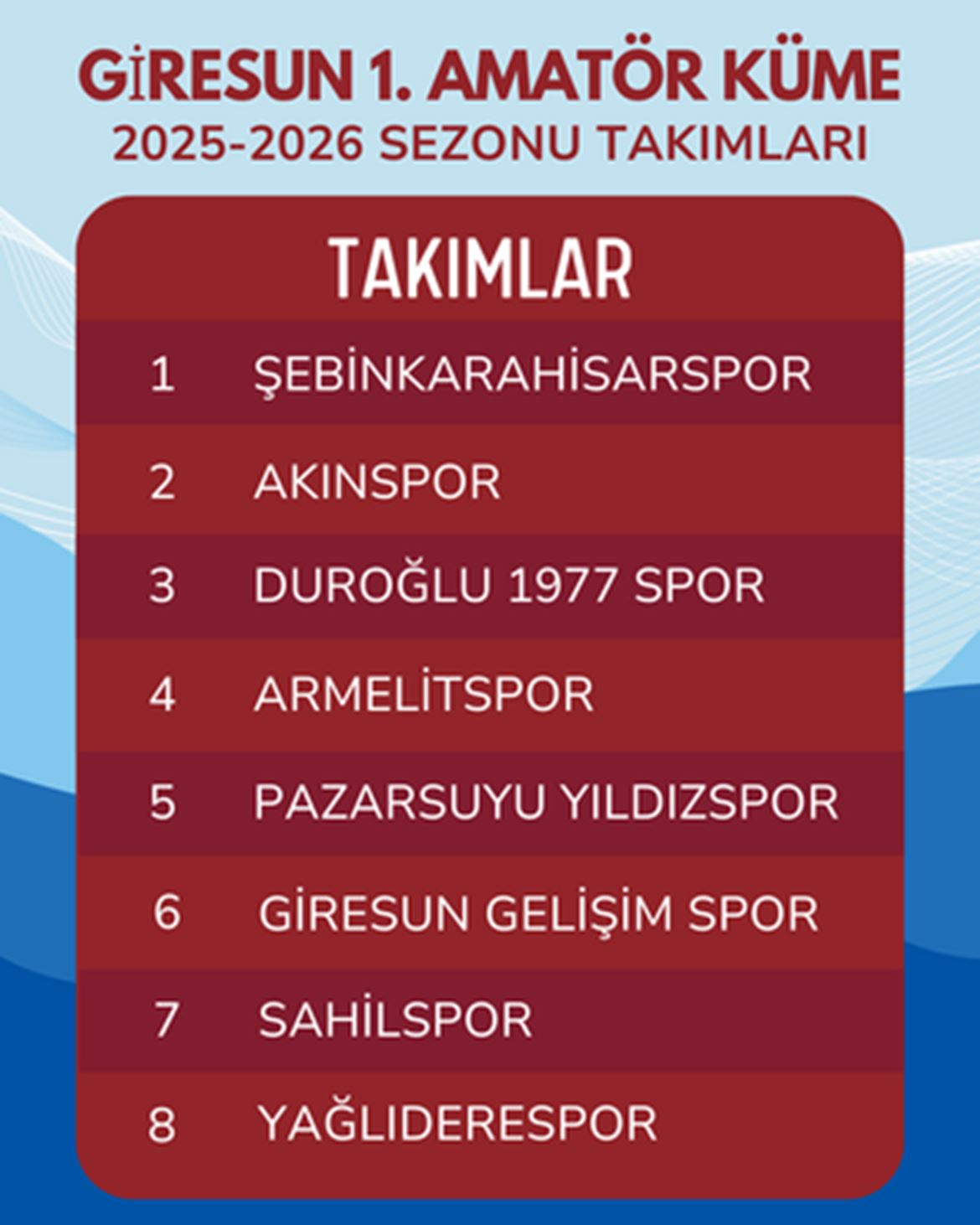 Toplam 14 hafta sürecek ligde Şebinkarahisarspor, Akınspor, Pazarsuyu Yıldızspor, Giresun Gelişim Spor, Yağlıderespor, Armelitspor, Sahilspor ve Duroğlu 1977 Spor mücadele edecek.